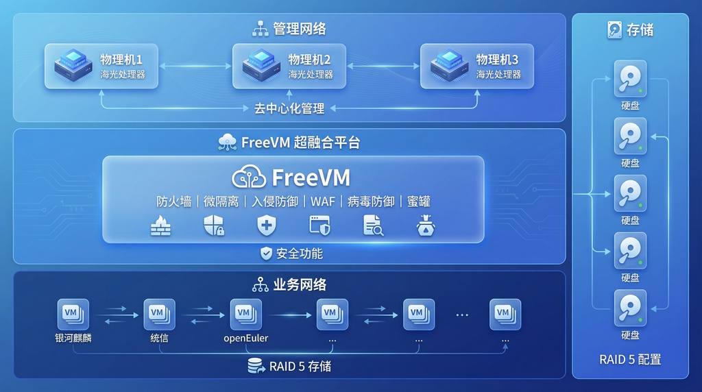 硬件(海光CPU)+软件(FreeVM)全栈国产化,符合政策要求。