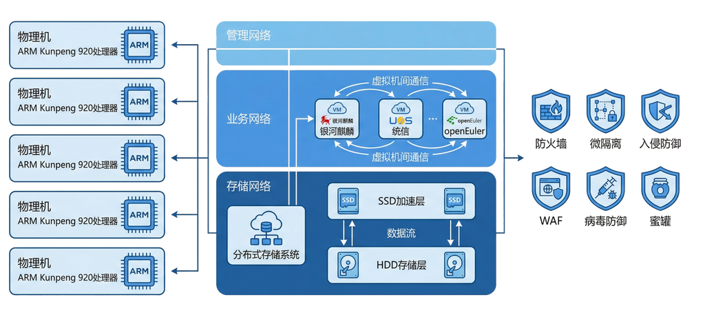 国产超融合系统:采用FreeVM专业版,支持ARM架构适配,提供虚拟机HA、负载均衡、在线迁移等功能。分布式存储引擎:内置国产化存储协议,支持三副本冗余,确保数据可靠性达99.9999%。