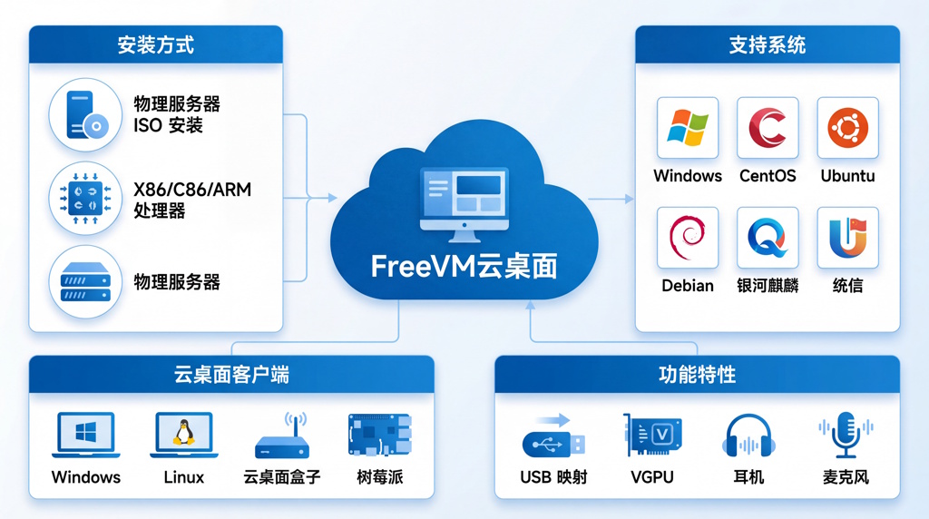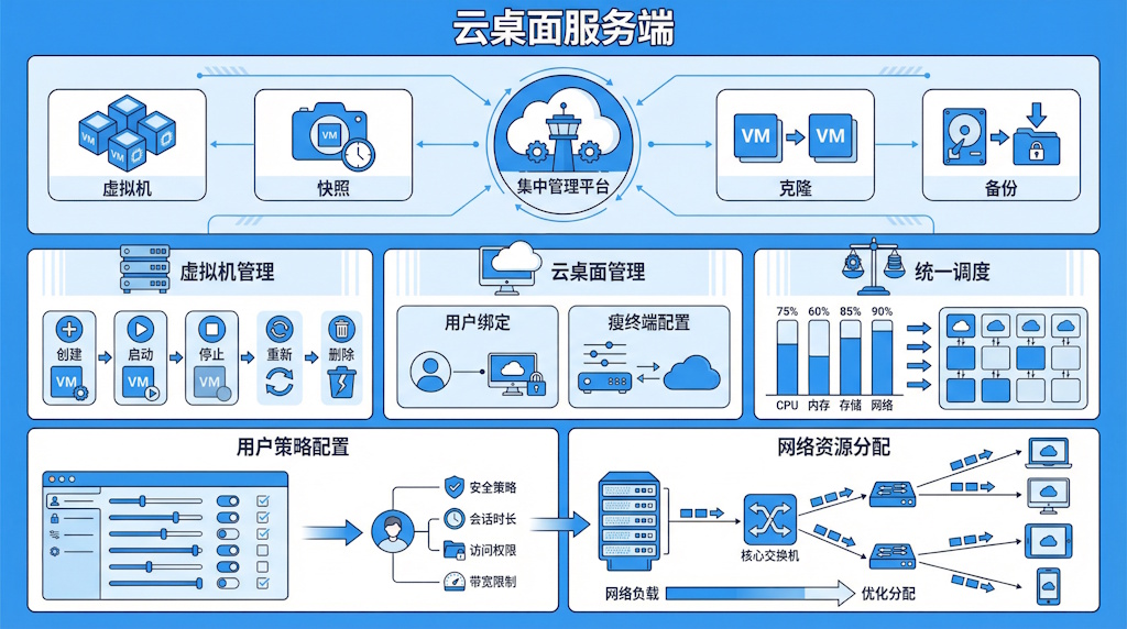 云桌面服务器端是集中管理和交付虚拟桌面的核心平台,主要提供虚拟机管理、快照、克隆、备份等功能,同时支持云桌面的统一调度、用户策略配置及网络资源分配。以下详细介绍其核心功能模块。