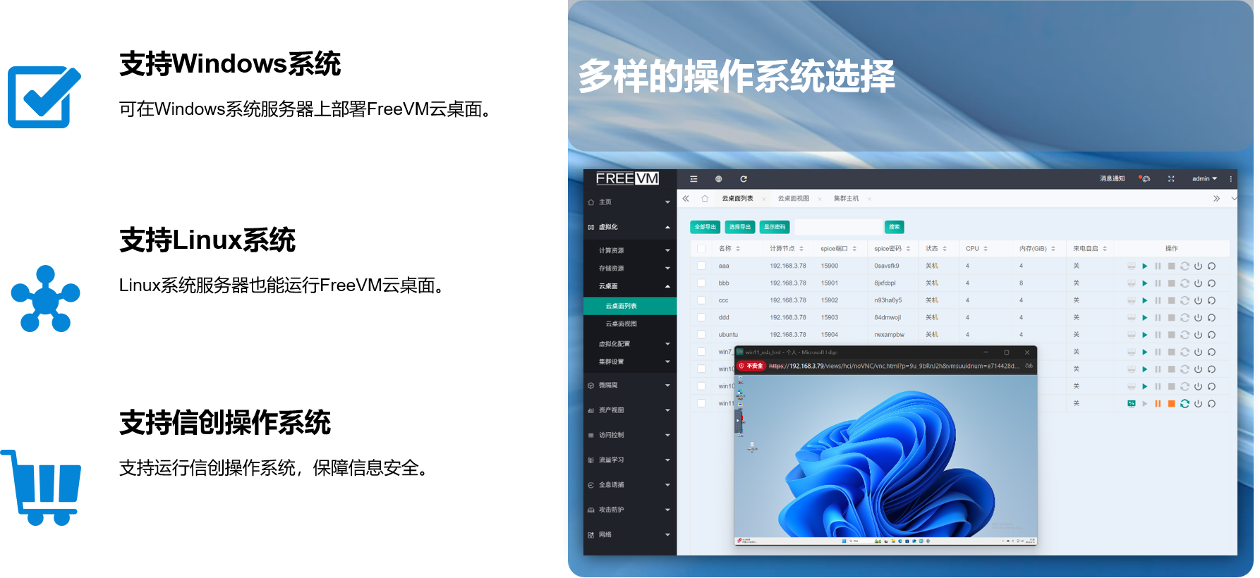 兼容主流远程协议:SPICE协议:优化图形显示与音视频传输,适合高画质需求场景(如设计、视频编辑),RDP协议:提供稳定的远程连接,适配Windows云桌面及企业级应用,支持双向剪贴板、本地设备映射等功能。
