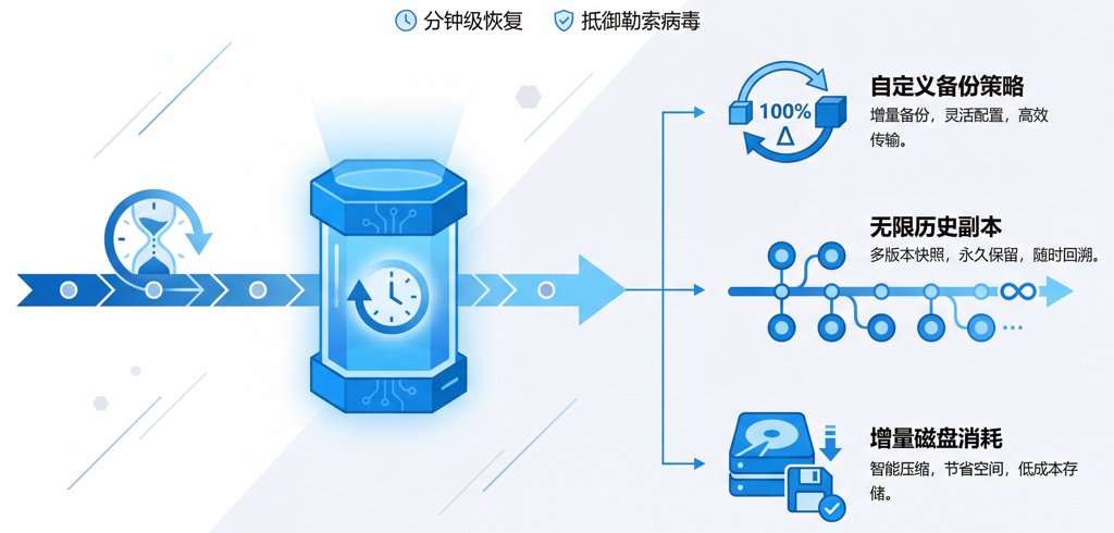 采用完全增量备份技术,并自定义了一套增量备份恢复机制,支持将VM虚拟机恢复到过去任何一分钟。有效抵抗勒索病毒造成的危害。