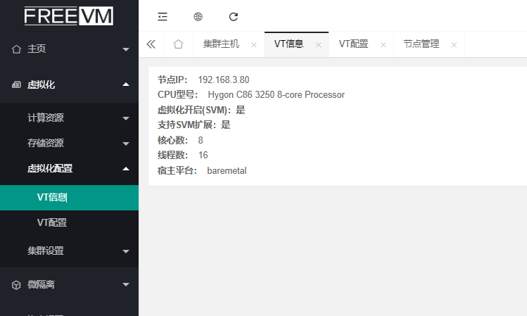 海光处理器是一款国产化处理器,具备高性能、低能耗和高安全性的特性,其虚拟化技术不同于Intel的VT技术。其采用了多核心、多线程的设计,支持并行计算和虚拟化技术,为信创行业的应用提供了强大的计算能力和性能,并为FreeVM虚拟化技术提供了卓越的硬件支持。